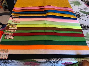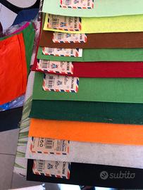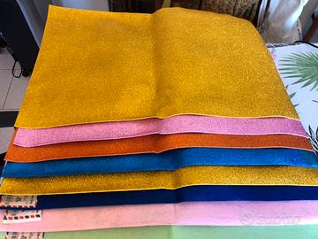 19 fogli in feltro vari colori 40x60cm di vario spessore, 6 fogli gomma eva glitter 40x60 cm spessore 2 mm vendo solo in blocco aggiungo in regalo circa 20 fogli misti in quanto parzialmente usati