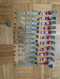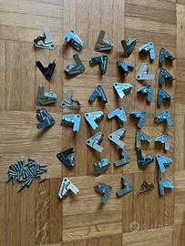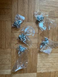 Ferramenta besta 28 piedini grigi 4 piedini neri 3 raccordi di collegamento barre di sospensione 14 distanziatori neri + uno più piccolo 2 tappi trasparenti per chiedere buchi delle ante dei cassetti 4 tappino trasparenti per chiudere buchi delle ante dei cassetti 32 rondelle e 14 viti 13 viti lunghe 2 viti/ spine 2 viti tonde 38 Sostegni per mensola e 32 viti Parte dei piedini della METOD Billy 23 staffe con ognuna due rondelle e una vite 4 viti/spina 5 pacchetti di viti Ikea. Ogni sacchetto contiene 8 viti Offerta libera