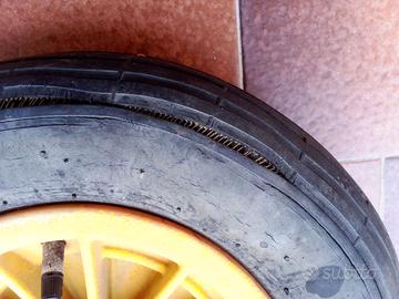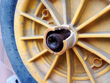 Ruota carriola – gomma V-RACE 3.50-8 max carico 130 kg – usata, in cattive condizioni (pneumatico slabbrato, plastica di protezione perno scoppiata, perno centrale bloccato in un solo lato del foro)