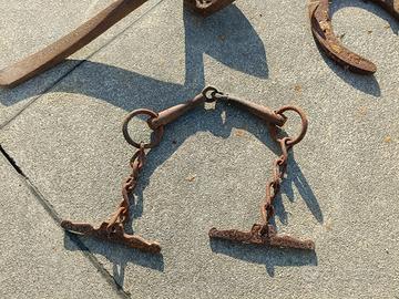 accessori antichi per taverna o ambiente rustico: ferri di cavallo, morsi di cavallo e buoi, bidoni / gamelli del latte in alluminio.