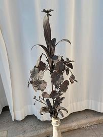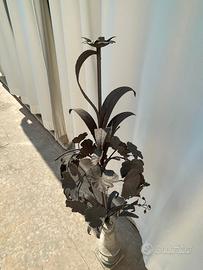 Elaborato ferro battuto di artigiano fine 1800, montato su base in pietra di Vicenza scolpita. Il ferro battuto, realizzato da artigiani trentini alla fine del 1800 - inizio 1900 ha il tipico gusto floreale art nouveau. L'oggetto presenta alcuni difetti e mancanze. Misure: H. 90 cm x diametro cm 40 (con la base: h. 140 cm). “Ben tenuto, con segni del tempo dovuti ad un oggetto collocato all'esterno. Le foto rappresentano il bene.” E' richiesto il ritiro. Grazie