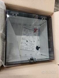 Armadietto, base, sportello con guarnizione in EPDM, chiusure di 3mm, viti per piastra di montaggio/guida DIN e spinotti angolari.