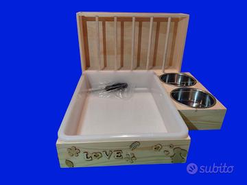 Il design intelligente riunisce porta fieno, lettiera e doppia ciotola in un unico accessorio compatto, pensato per ridurre gli sprechi di fieno e tenere tutto in perfetto ordine.