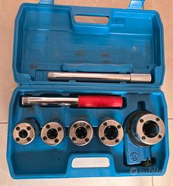 Il set include diverse testine per filiere di varie dimensioni, due manici tubolari in acciaio e una testa a cricchetto compatta.