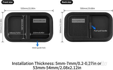 Finestra RV Push Pull Camper Caravan Roulotte Angoli Arrotondati 535x335 mm Finestra push pull per camper, progettata per garantire privacy, comfort e protezione dagli agenti atmosferici. Realizzata con materiali di alta qualità: lega di alluminio, gomma, ABS e vetro temperato, è robusta, resistente e perfettamente sigillata. Caratteristiche tecniche: • Dimensioni finestra: ca. 535x335 mm (21,06x13,18 pollici) • Spessore installazione: 5-7 mm (0,2-0,27 pollici) o 53-54 mm (2,08-2,12 pollici) con lamiera • Adatta per installazione verticale o orizzontale • Finitura liscia, lucidata e impermeabile La finestra è completamente sigillata per mantenere il camper fresco d’estate e caldo d’inverno, riducendo l’effetto del sole sull’interno. Include: • 1 telaio fisso • 1 confezione di tappi foro guida acqua (numero casuale) • 1 confezione di viti fisse (numero casuale)