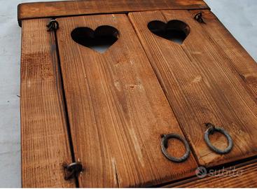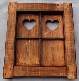 Deliziosa finestrella decorativa realizzata a mano, perfetta per aggiungere un tocco rustico e romantico alla tua casa. Gli scuri presentano un'intagliatura a forma di cuore. - Design artigianale unico. - Dettaglio a forma di cuore sugli scuri. Dimensioni 50x45x6cm