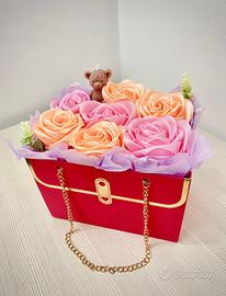 💐 Idea regalo fatta a mano Composizione con fiori in raso realizzati artigianalmente e candela in cera di soia. ❤️ Perfetto come regalo per San Valentino, 8 Marzo, e altre feste 📩 Scrivimi in privato