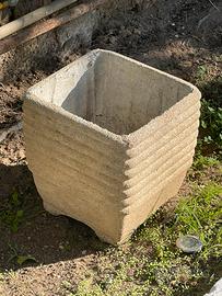 Un vaso di cemento con righe a rilievo scolpite e con il buco al centro per l’acqua larghezza 36 per 36 cm altezza terra 40 cm prezzo euro 50.