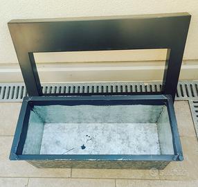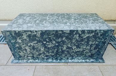 Fioriera rettangolare in metallo galvanizzato effetto cemento, adatta da esterno per balconi e terrazzi, o come elemento di arredo per ambienti minimalisti. Questo tipo di fioriera a doppio scomparto, dove la cassetta ospita le piante in vaso facilitando la gestione del terreno e l’irrigazione senza dover riempire l’intero contenitore. A seconda dell’ambiente in cui viene inserita può essere corredata del piano superiore nero come elemento decorativo. Misure interne base 60x25, altezza23 cm, piano esterno nero 71x50 cm. Produzione artigianale, no plastica.