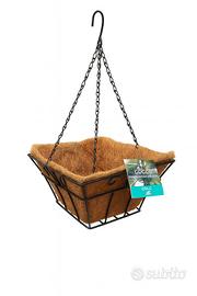 Cestino quadrato da appendere, realizzato con resistente struttura in metallo nero e rivestimento in fibra di cocco naturale.