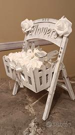 Vendo fioriera decorativa in legno richiudibile , decorata con fiori bianchi artificiali, nastri in raso, coppia di uccellini e perline. E' un ottimo regalo per sposi/coppie o decorazione per casa