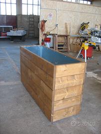 Fioriera di grandi dimensioni, con parete da mm. 32 di spessore, rivestimento interno in lamiera zincata sia pereti che fondo, colorazione noce di diverse tonalità, ceratura esterna, tirante interno. Dimensioni 80/100/120/150/200, altezza cm. 50/63, profondità cm. 40. A partire da € 115
