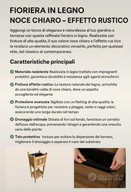 Fioriera in legno noce chiaro (effetto rustico) Questa elegante fioriera in legno, realizzata con finiture di alta qualità, porta un tocco di natura e rusticità in ogni angolo del tuo giardino o terrazzo. Il suo colore noce chiaro, arricchito da un effetto rustico, la rende un elemento decorativo ideale per ambienti esterni, che si adatta facilmente a qualsiasi stile, dal classico al contemporaneo. L 35 cm L 30 cm A 1.00 cm