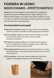 Questa elegante fioriera in legno, realizzata con finiture di alta qualità, porta un tocco di natura e rusticità in ogni angolo del tuo giardino o terrazzo. Il suo colore noce chiaro, arricchito da un effetto rustico, la rende un elemento decorativo ideale per ambienti esterni, che si adatta facilmente a qualsiasi stile, dal classico al contemporaneo.
