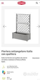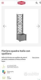 Vendo set completo composto da 2 fioriere rettangolari e 1 quadrata con spalliera Stefanplast, già montate e con 3 piante di gelsomino rampicante. Ideali per creare privacy su terrazzo o giardino. Struttura solida, effetto legno, colore grigio. Condizioni buone, come da foto. Preferisco vendere in blocco unico. Prezzo già ribassato per vendita veloce