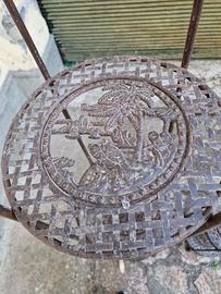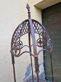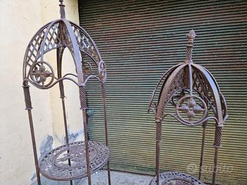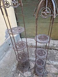 Coppia di colonne porta vasi in ferro pieno e ghisa, artigianali, risalenti alla metà del XX secolo. Il motivo centrale dei piatti è in ghisa.