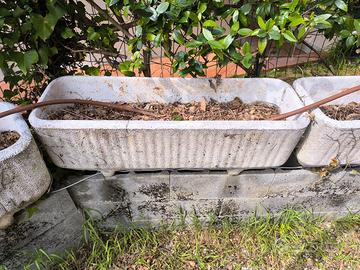 Fioriere di cemento bianco lunghezza 100 cm, larghezza 30 cm altezza 40 cm (compresi i piedini). Vengono fornite pulite e lavate. Disponibilità 20 fioriere. Ritiro a carico dell'acquirente. 40 euro l'una. 30 euro l'una se comprate in blocco.