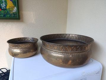 fioriere vintage lavorate a mano, in ottone. Diametro 41 cm quella grande e 26 cm quella piccola. Vendo sia singolarmente che coppia.