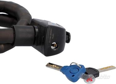 Catena ad alta resistenza, rivestita con rotule sferiche in acciaio speciale. Grazie alla copertura ben posizionata sulla serratura del lucchetto, non entra lo sporco.