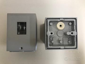 Due apparecchi da installazione a parete per esterni, colore grigio.