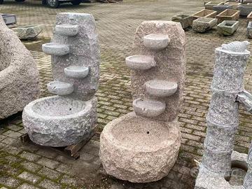 Fontana a cascata scolpita a mano da un massello di granito grigio o rosa. NON è di cemento, graniglia o polvere di marmo, non soffre il gelo.