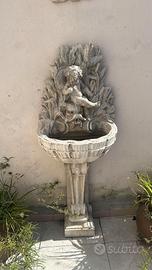 Elegante fontana da giardino in pietra, seconda metà ‘800, composta da putto/cherubino e mascherone grottesco utilizzato come bocca di erogazione.