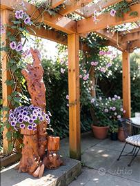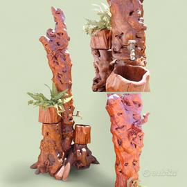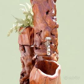 Fontana in legno "I Sarvanot", articolo unico nel suo genere, completamente realizzata a mano da un anziano artigiano restauratore, articolo nuovo, finitura tinta ciliegio/ castagno, completa di portavaso e rubinetto. Altezza 220 cm