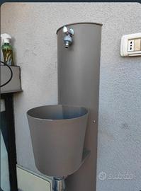 Fontana da giardino a parete dal design innovativo e originale, 42/PRT con Rubinetto e Secchio della Belfer, che permette l'installazione con allacciamenti acqua/scarico ad altezze variabili: altezza allacciamento acqua da 0 fino 116cm, altezza allacciamento scarico da 0 fino 55 cm.