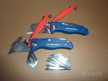 Taglierino cutter pieghevole con blocco Workpro, struttura in acciaio inox, supporto gommato per appoggio confortevole del pollice, robusta clip inox da cintura, 5 lame di scorta in acciaio SK5 trattenute da calamita all’interno dell’impugnatura, lunghezza chiuso 10,5cm - aperto 16cm.