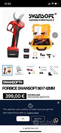 La Swansoft 8617 è uno strumento ad alte prestazioni progettato per la potatura intensiva. Combina un'elevata capacità di taglio con un controllo elettronico di precisione, ideale per professionisti del settore agricolo e del verde. Capacità di taglio: fino a 42 mm di diametro. Motore Brushless: maggiore efficienza, silenziosità e durata nel tempo senza manutenzione delle spazzole. Lame in Acciaio SK5: Alta resistenza e affilatura durevole per tagli netti che favoriscono la salute della pianta. Controllo Progressivo: Taglio preciso e modulabile tramite il grilletto, con funzione di doppia apertura regolabile. Monitoraggio Integrato: Display LCD per il controllo immediato del livello batteria e del numero di tagli effettuati. Specifiche Tecniche Apertura Massima42 mm Motore: brushless (Senza spazzole) Materiale: lame in acciaio al carbonio SK5 Funzioni: taglio progressivo / Doppia apertura Autonomia: 8 ore (con dotazione standard) Ideale per: vigneti, frutteti e manutenzione del verde pubblico. Uno strumento super robusto, bilanciato e progettato per ridurre lo sforzo fisico al minimo dell'operatore durante sessioni prolungate. Il costo attuale del prodotto si aggira solitamente intorno ai 380 euro. Vendo KIT completo per inutilizzo. Solo se interessati realmente, posso applicare un piccolo sconto.