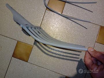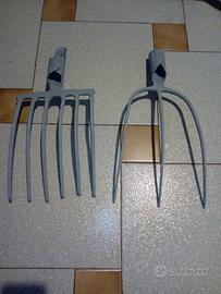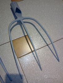 - Q. 1 forca da fieno, pacciame, rifilatura di alberi ecc., 3 denti di diametro 8 mm, distanza tra denti 7 a 10cm, dimensione d'ingombro 42x20cm, peso 0,5Kg, occhio per manico 40mm, 9 Euro.