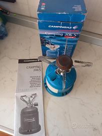 fornello da campeggio a gas monofiamma. Marca Campingaz 206 S. Ideale per campeggio - feste ed escursioni. Potenza 1200W. Colore Blu.Usato 2 volte. Cartuccia del gas non inclusa..