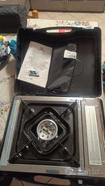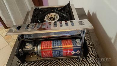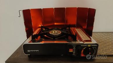 Vendo fornello a gas portatile Kemper, con paravento o senza, perfetto per campeggio, pic-nic, barca o come cucina di emergenza all'aperto. Il fornello è compatto, robusto e facile da usare . Si accende con un clic, senza bisogno di fiammiferi o accendini. Regolazione della fiamma, manopola laterale per controllare l'intensità del calore. Sicurezza: sistema di blocco e sgancio automatico della cartuccia. funziona con cartucce di gas butano a incastro Condizioni, ottime, usato poco. Perfettamente funzionante. Vendo con sua valigetta Prezzo 18€ singolo 25€ con paravento