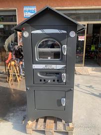 Con ruote e tetto. Camera di cottura Inox 430 fissa, dimensione 45x80 cm, 3 ripiani cottura, base in refrattario alimantare, illuminazione. Tempi di riscaldamento 300°C in 40/50 minuti. Consumo legna 4/8 kg ora. Tipo di cottura indiretta (camere di combustione e cottura separate). Coibentazione in lana di roccia Con ventilazione smart, comignolo inox Ø 13 cm, termometro, sportelli in acciaio, 2 griglie, 2 teglie in alluminio, termometro, contaminuti. Alimentazione legna. Peso 280 kg.