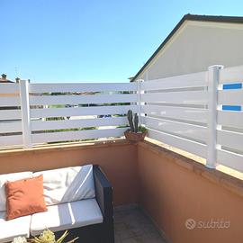 Recinzione in PVC bianco semi-aperta. Garantisce privacy limitando la vista dall'esterno, ma permette a te di guardare fuori. Fornita in kit già tagliato su misura.