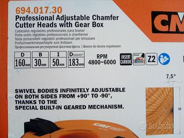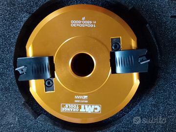 Fresa Legno Testa a smussare Regolabile CMT da 0 a 180 gradi nuova con coltelline da 5 cm. reversibili al Widia Tunghesteno diametro 160 mm. foro centrale per albero 30 mm. corpo in Allumino e acciaio mai usata vendo per errato acquisto ritiro su Grosseto o spedizione.