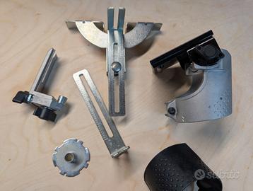 Motore, base fissa standard, base inclinabile (ricercatissima), guida parallela, guida a rullo, adattatore aspirazione, flangia per anelli a copiare e valigetta originale.