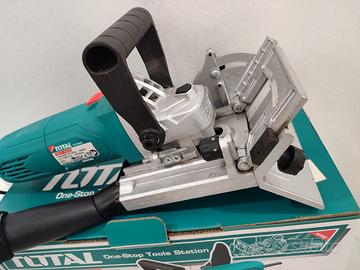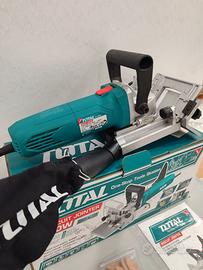 Fresatrice lamellare 950W TOTAL compreso nel kit 15 tasselli +1 set spazzole carbone di ricambio + il kit raccogli polveri con pratica cerniera per lo svuotamento.