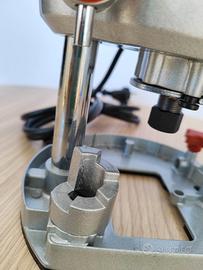 Fresatrice NUOVA, mai usata. COMPRESE 10 FRESE e VALIGETTA SPECIFICA per il trasporto e lo stoccaggio. Costruzione robusta e di qualità, piastra metallica rivestita in materiale sintetico antigraffio, impugnature rivestite in gomma antiscivolo dotata di ottimo grip. Regolazione velocità su una delle due impugnature. Pulsante di avvio sull'altra impugnatura, di sicurezza (funzionamento unicamente a 'presenza uomo'). Utilizza sia frese con gambo di diametro da 8 mm che da 6 mm.! Dispositivo per il cambio utensile rapido senza l'utilizzo di attrezzi. Asta di profondità con battuta multimisura a 7 posizioni (!). Ulteriore regolazione della profondità di taglio fine, tramite manopola specifica. Regolazione velocità 10.000-30.000 giri/minuto. Costruzione robusta. Valigetta compresa in plastica con clip di chiusura metalliche. NUOVA, MAI USATA, aperta solo la confezione per fare le foto.