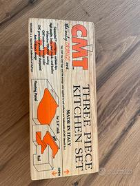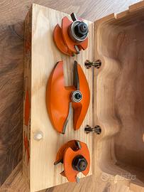 Set di frese per ante classiche, profilo, controprofilo e piattabanda, albero 12,7 mm, usate per fare 4 ante in abete. Perfette e ancora affilate, praticamente nuove.
