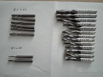 -N.1 Fresa sferica HW integrale D.40(R.20) DX L.185 LT.70 Z.4(Euro.150 CAD) (foto 1) -N.1 Fresa sferica HW integrale D.20(R.10) DX L.200 LT.60 Z.4(Euro.100 CAD) (foto 1) -N.1 Fresa elicoidale per sgrossatura HW integrale D.25 DX L.250 LT.70 Z.3(Euro.150 CAD) (foto 1) -N.1 Fresa elicoidale per sgrossatura HW integrale D.20 DX L.120 LT.50 Z.3(Euro.80 CAD) (foto 1) -N.1 Fresa elicoidale per finitura HW integrale D.20 LT.200 L.60 Z.3(Euro.100 CAD) (foto 1) -N.2 Fresa elicoidale per finitura HW integrale D.20 DX L.150 LT.90 Z.3(Euro.130 CAD) (foto 1) -N.1 Fresa saldobrasata a coltellini inclinata 7° D.70 x 40 DX Z.2(Euro.70 CAD) (foto 1) -N.21 Frese elicoidali vari diametri da 3 a 10 (Euro.20 CAD) (foto 2) -N.4 Frese lappate per plexiglass vari diametri da 5 a 14 (Euro.15 CAD) (foto 3) Frese nuove o affilate una sola volta. Merce a marchi Leitz e Bergamo utensili . Vendo per cessata attività. Valuto sia vendita in blocco che parziale. Consegna a mano in zona o spedizione a carico del destinatario. Prezzo da concordare.