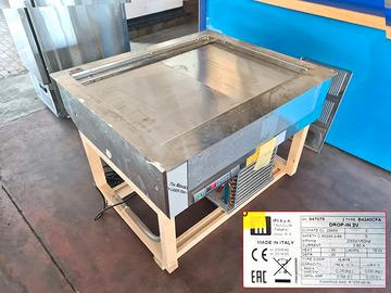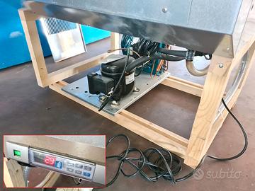 frigo espositivo per bubble tea usata, in realtà si tratta di un piano refrigerato in acciaio inox a incasso con telaio in legno, di marca IFI S.p.a mod. Drop-in 2V funzionante a 230v utilizzata per conservare: pasticcini, bibite, torte, etc.