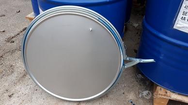 Fusti in metallo verniciato da 208 litri, dimensioni 86 cm di altezza e 58 cm di larghezza. Completi di coperchio e fascetta di chiusura ermetica a leva con guarnizione.