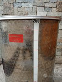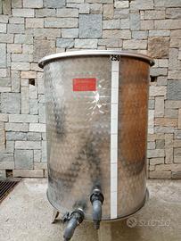 Vendesi fusto in acciaio inox alimentare per olio o vino da 250 litri di capienza, compreso di coperchio e piedistallo in buone condizioni.