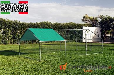 Pollaio, recinto per animali da esterno 3 x 6m x 2m H - 18 mq Prezzo 328 euro IVA E TRASPORTO INCLUSI La nostra spaziosa e versatile gabbia per animali / pollaio di 6x3m e' l'ideale per la custodia di polli, galline, anatre e altri piccoli animali domestici e da cortile come cani, gatti , conigli , oche e altri volatili di grandi dimensioni. Realizzata con struttura tubolare disezione 38mm e spessore interno 1mm in acciaio zincato di alta qualita'. Rete metallica rivestita in pvc con alveoil 25x25mm e prodotta con filo di spessore 1mme' fornita di una tettoia parasole, resistente ai raggi UV ed impermeabilein Polietilene. La nostra gabbia e' provvista di rinforzi trasversali con supporto di fissaggio centrale a terra che, insieme alle altre caratteristiche strutturali, le conferiscono un'impareggiabile stabilita'. Facile da costruire, il telaio della gabbia e' dotato di meccanismo di assemblaggio ad aggancio rapido. Caratteristiche Tecniche * Dimensioni: 3m x 6m x 2m H * Altezza Fianco: 120cm * Dimensioni apertura Porta: 56cm x 158cm * Porta con sistema di montaggio regolabile che permette di modificare le dimensioni del battente della porta in modo da bloccare qualunque tentativo di accesso da parte di animali predatori. * Sistema di chiusura con lucchetto * Struttura tubolare in acciaio zincato da 38mm e spessore interno 1mm * Telaio ad aggancio rapido * Rinforzi trasversali a terra (unica sul mercato) * Rete Metallica rivestita in PVC, con alveoli da 25mm x 25mm e spessore del filo 1m * Colore Telone giallo * Telone in Polietilene 190cm x 300cm * 18 MQ * Peso totale 95kg (verificate sempre il peso delle strutture, diffidate da pesi troppo bassi) Telefono/Whatsapp: