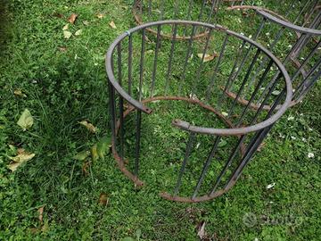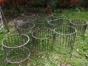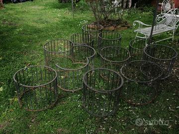 Gabbie decorative in ferro battuto per la protezione dei tronchi degli alberi. Le gabbie circolari sono 11 hanno la cerniera e la chiusura, sono alte 40 cm e hanno un diametro interno di 50 cm.