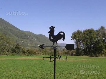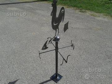 Gallo segnavento in ferro con banderuola cardinali, altezza compreso di paletto cm. 123, lunghezza freccia cm. 75, banderuola cardinali diametro cm. 50, completamente smontabile con all'interno n. 2 cuscinetti in acciaio. Completo di verniciatura per esterno di colore nero oppure di colore nero con patinatura argento.