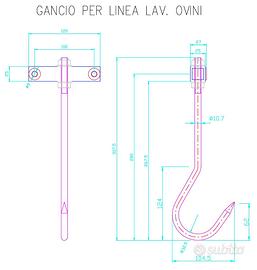 Vendo nr.35 ganci in acciaio inox per l'appendimento ovini o altre tipologie di carni, completi di profilo tubolare 20x20 per fissaggio a catena aerea motorizzata.