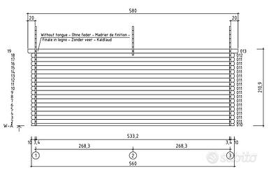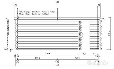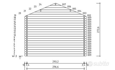 Lunghezza 560 cm (tetto 580 cm, netto pareti 540 cm, misura interna 533,2 cm) Larghezza 320 cm (tetto 340 cm, misura interna 296,6 cm) Altezza colmo 273,6 cm, parete 210,9 cm spessore legno 34 mm tetto in perline ad incastro da 15 mm doppia porta carrabile 229x197h porta laterale pedonale 78x188h IL PRODOTTO VIENE VENDUTO IN KIT DA ASSEMBLARE, INCLUDE : GUAINA BITUMINOSA GRIGIA TUTTA LA FERRAMENTA DI MONTAGGIO ISTRUZIONI CON IMMAGINI PASSO-PASSO