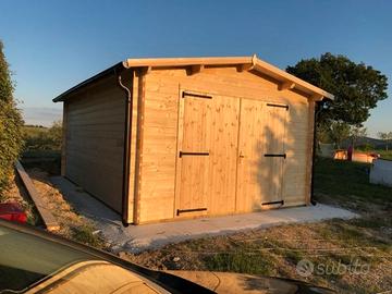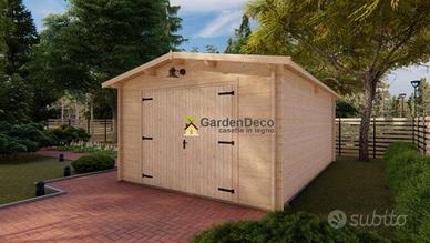 Garage in legno massello di pregiato abete bianco nordico naturale.Adatto come rimessa per autoveicoli e attrezzi da giardino.Struttura in legno in grado di contenere al suo interno al massimo un'autovettura ma offrendole efficacemente protezione dalle intemperie. E' dotato di portone carrabile in legno massello a due battenti e di una finestra a due ante. E' possibile acquistare dalla nostra sezione "Accessori" tegole bituminose canadesi di colore verdi e rosse, impregnante di vari colori, grondaie, porta basculante e tanti altri accessori utili per il tuo prefabbricato. Il pavimento non è incluso.